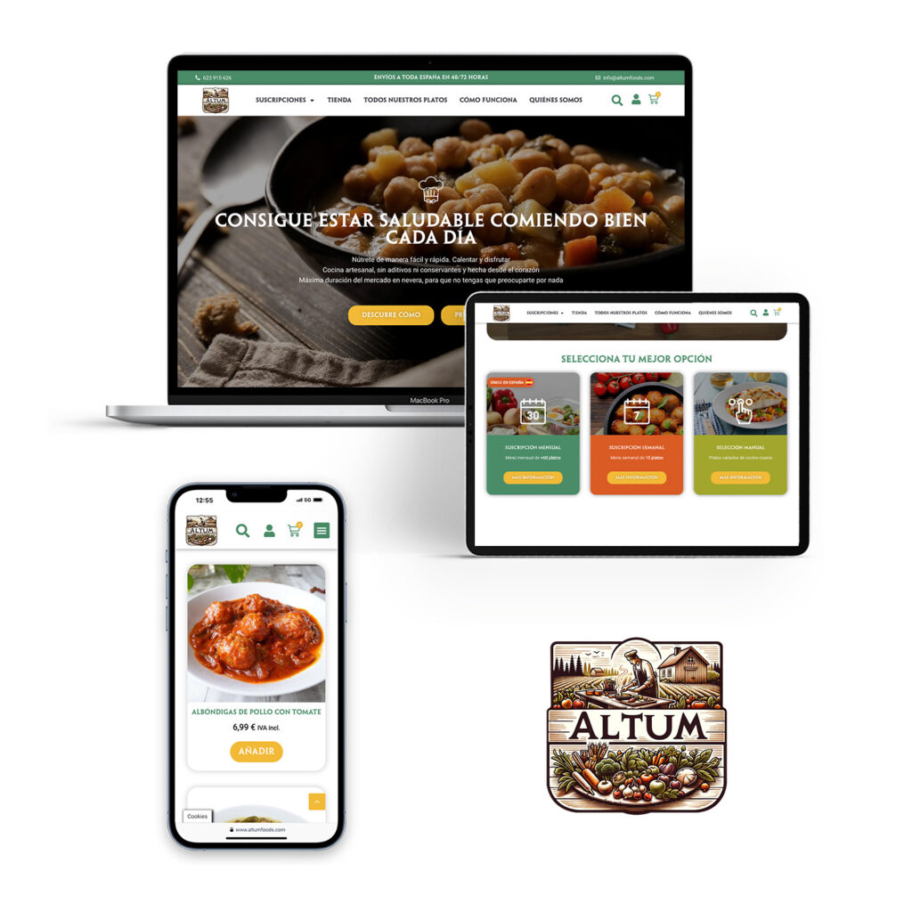 Desarrollo de tienda online en WooCommerce adaptada a todos los dispositivos: ordenador y móvil. Vende tanto platos saludables, a elección del cliente, como suscripciones mensuales o semanales de menús, igualmente saludables. Altum Foods se desarrolló con un diseño muy personal, siguiendo las indicaciones de nuestro cliente. La navegación por la tienda online es fácil e intuitiva y el proceso de compra está muy optimizado. No podrás resistirte a comprar en ella.